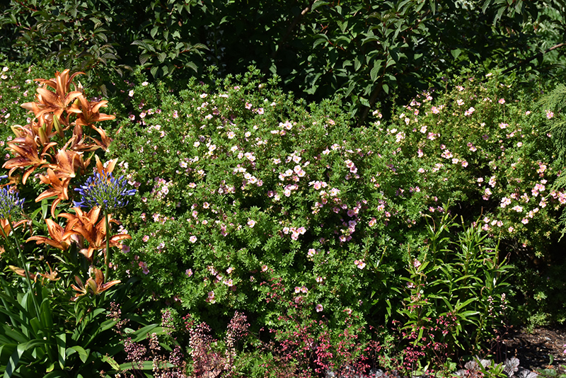 Pink Beauty Potentilla will grow to be about 24 inches tall at maturity, with a spread of 24 inches. It tends to fill out right to the ground and therefore doesn't necessarily require facer plants in front. It grows at a slow rate, and under ideal conditions can be expected to live for approximately 30 years.