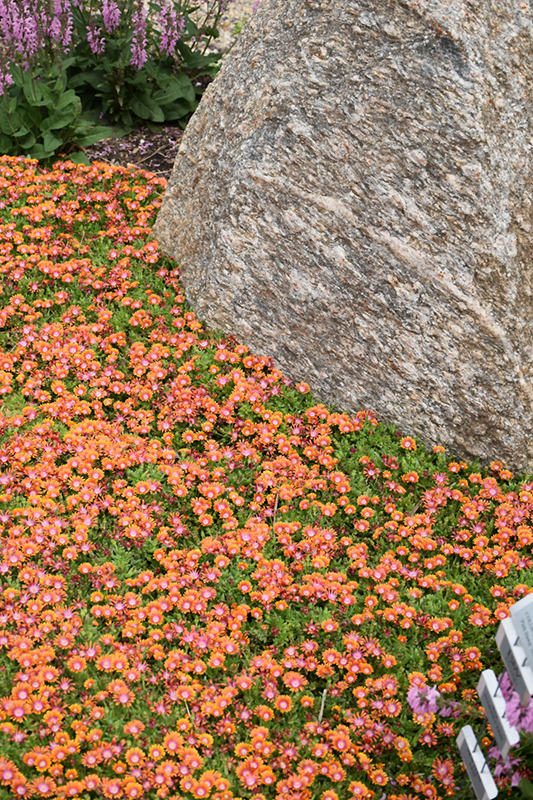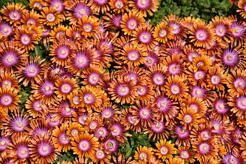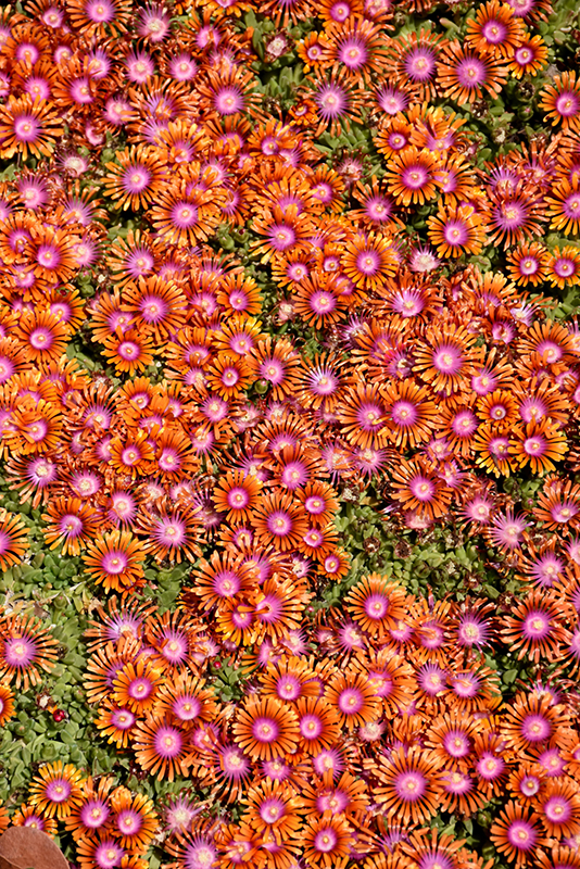 low spreading succulent, native to South Africa but amazingly hardy in North America; dazzling orange-red daisy-like flowers with a bright purple ring; perfect for xeriscapes, rock gardens, screes and sandy soils