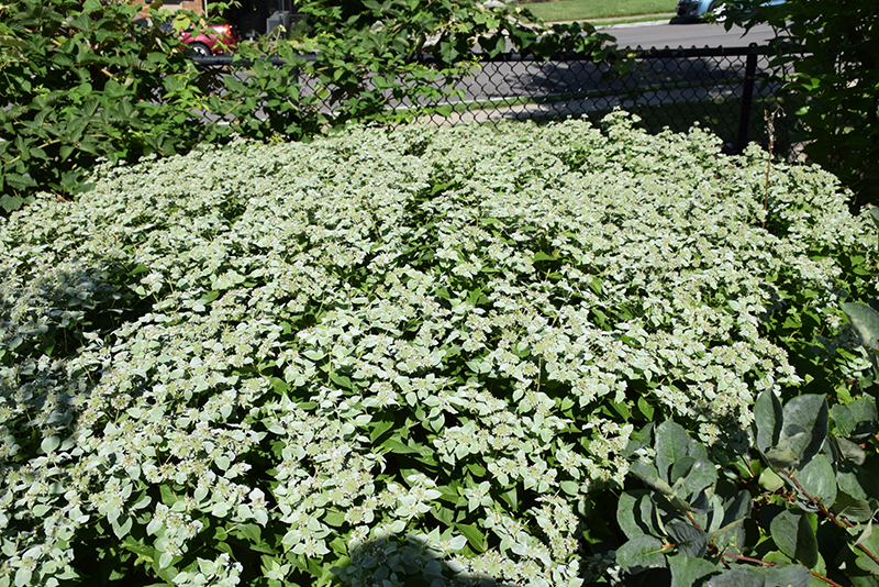 Smooth Mountain Mint will grow to be about 3 feet tall at maturity, with a spread of 24 inches. When grown in masses or used as a bedding plant, individual plants should be spaced approximately 20 inches apart. It grows at a fast rate, and under ideal conditions can be expected to live for approximately 5 years. As an herbaceous perennial, this plant will usually die back to the crown each winter, and will regrow from the base each spring. Be careful not to disturb the crown in late winter when it may not be readily seen!
