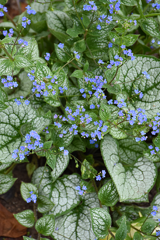 Attractive, large heart shaped leaves are green veined, with silver overlay and dark green edges; clusters of tiny flowers open white and blue, maturing to lavender-purple; best in moist, rich, well drained soil