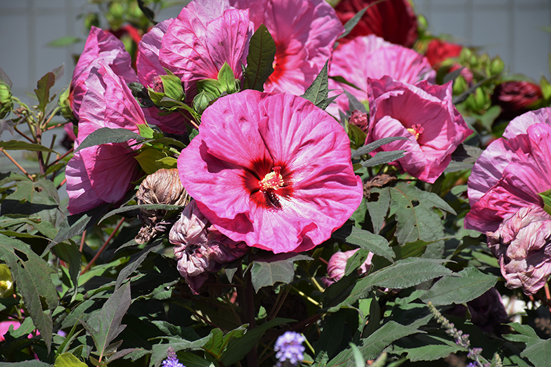 Summerific® Berry Awesome Hibiscus features bold lavender round flowers with pink overtones, red eyes and creamy white anthers along the stems from mid summer to early fall. Its large serrated lobed leaves remain dark green in color with distinctive red veins throughout the season.