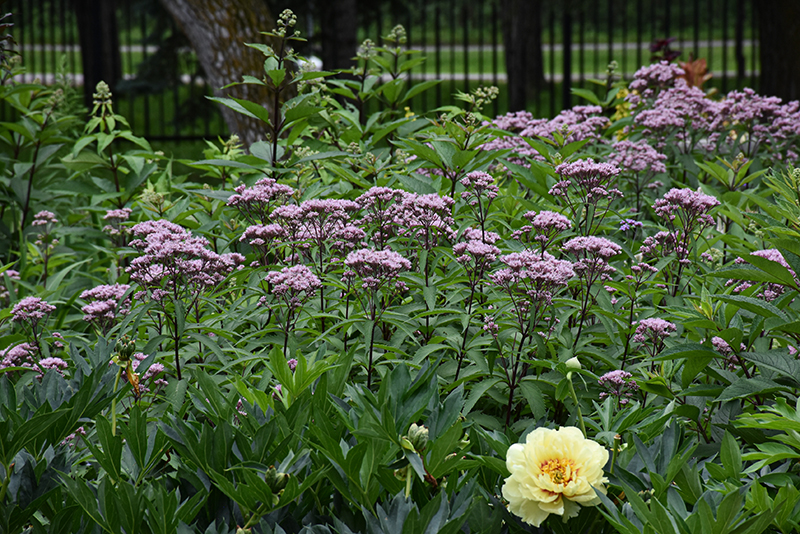 Joe-Pye Weed will grow to be about 4 feet tall at maturity extending to 6 feet tall with the flowers, with a spread of 3 feet. When grown in masses or used as a bedding plant, individual plants should be spaced approximately 3 feet apart. It tends to be leggy, with a typical clearance of 1 foot from the ground, and should be underplanted with lower-growing perennials. It grows at a medium rate, and under ideal conditions can be expected to live for approximately 15 years. As an herbaceous perennial, this plant will usually die back to the crown each winter, and will regrow from the base each spring. Be careful not to disturb the crown in late winter when it may not be readily seen!