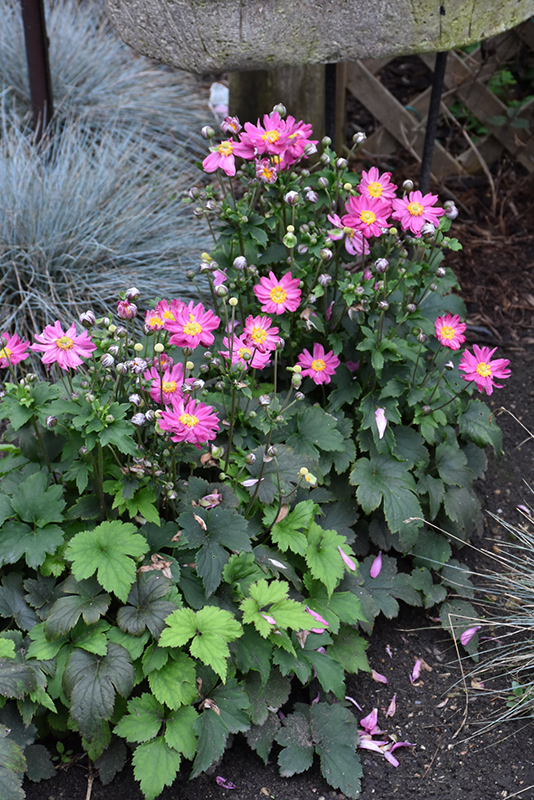 Curtain Call Deep Rose Anemone will grow to be about 12 inches tall at maturity extending to 18 inches tall with the flowers, with a spread of 18 inches. When grown in masses or used as a bedding plant, individual plants should be spaced approximately 14 inches apart. Its foliage tends to remain dense right to the ground, not requiring facer plants in front. It grows at a medium rate, and under ideal conditions can be expected to live for approximately 10 years. As an herbaceous perennial, this plant will usually die back to the crown each winter, and will regrow from the base each spring. Be careful not to disturb the crown in late winter when it may not be readily seen! As this plant tends to go dormant in summer, it is best interplanted with late-season bloomers to hide the dying foliage.