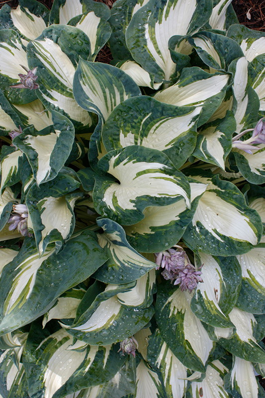 Hans Hosta features dainty spikes of lavender tubular flowers rising above the foliage from early to mid summer. Its attractive crinkled heart-shaped leaves remain creamy white in color with distinctive dark green edges and tinges of light green throughout the season.
