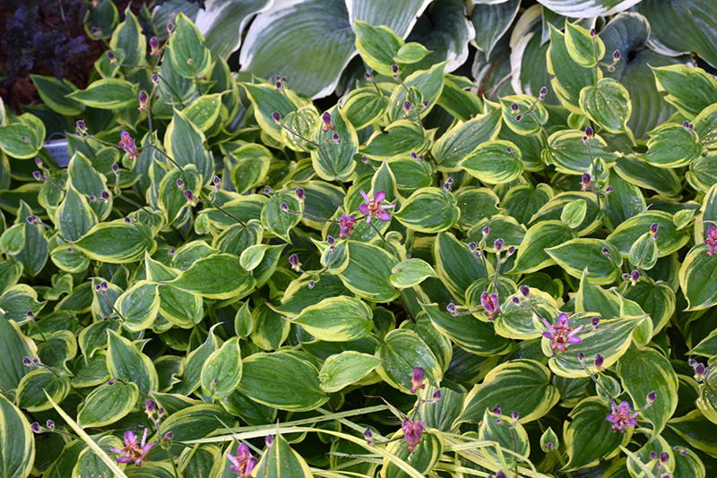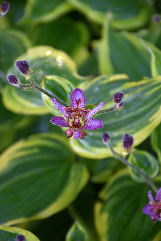 Autumn Glow Formosa Toad Lily has lilac purple orchid-like flowers with chartreuse overtones and plum purple spots at the ends of the stems from mid summer to early fall, which emerge from distinctive dark red flower buds, and which are interesting on close inspection. The flowers are excellent for cutting. Its attractive oval leaves remain green in color with distinctive yellow edges throughout the season.