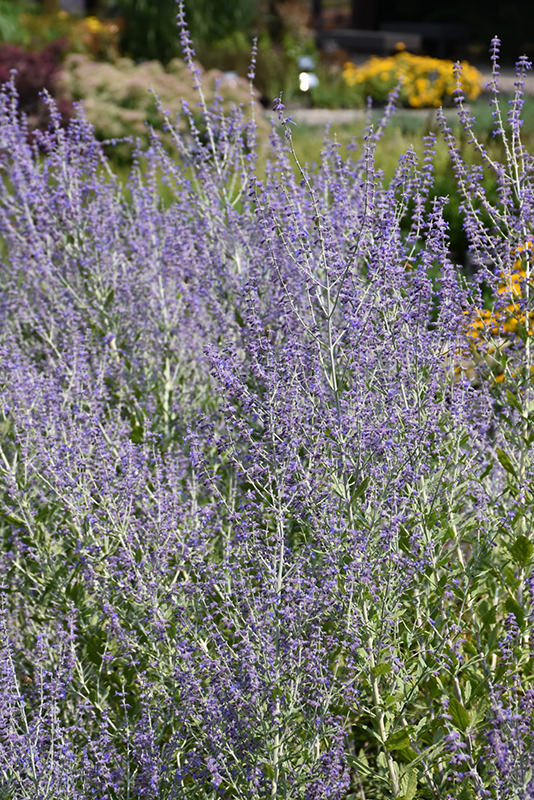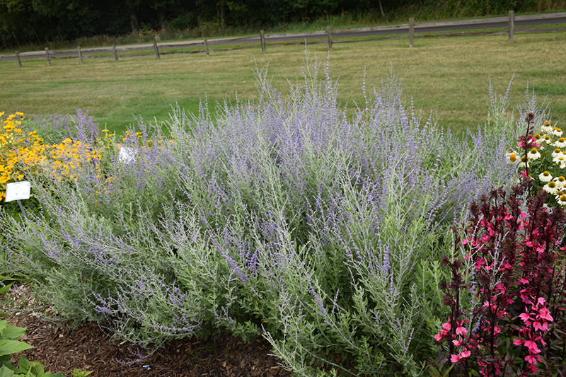 Blue Steel Russian Sage will grow to be about 24 inches tall at maturity extending to 3 feet tall with the flowers, with a spread of 28 inches. When grown in masses or used as a bedding plant, individual plants should be spaced approximately 24 inches apart. It grows at a fast rate, and under ideal conditions can be expected to live for approximately 10 years. As an herbaceous perennial, this plant will usually die back to the crown each winter, and will regrow from the base each spring. Be careful not to disturb the crown in late winter when it may not be readily seen!