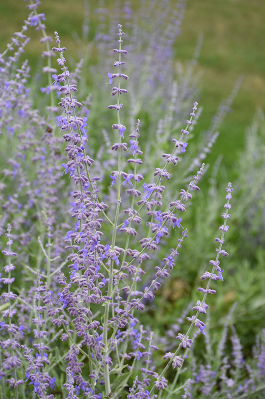 Blue Steel Russian Sage features delicate spikes of lavender flowers with blue overtones and purple calyces rising above the foliage from early to late summer. The flowers are excellent for cutting. Its attractive fragrant narrow leaves emerge silver in spring, turning grayish green in color throughout the season.