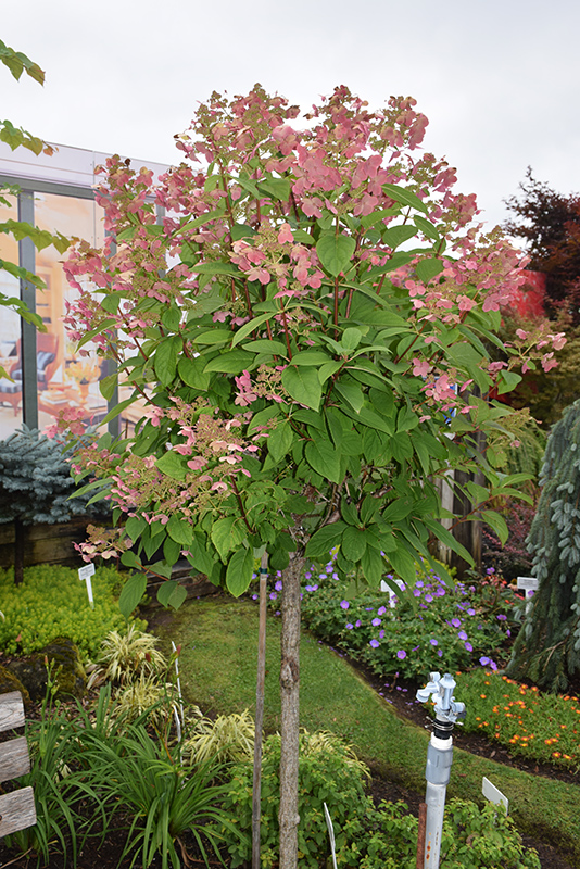 A version of this popular selection grafted onto a single trunk; this variety blooms a full month ahead of other panicle hydrangeas; features large conical flower heads that start white and fade through pink to a rich rose lasting into fall