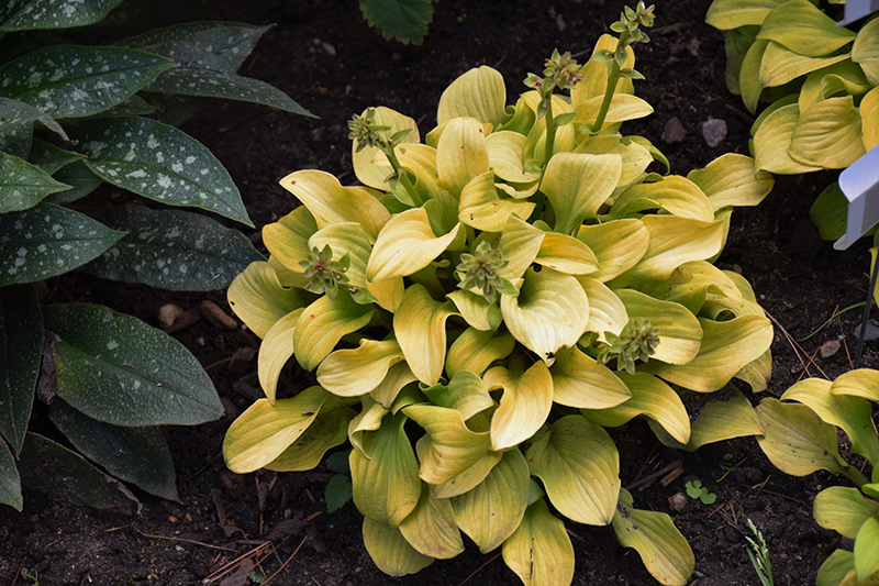 Sun Mouse Hosta features dainty spikes of lavender tubular flowers rising above the foliage in mid summer. Its attractive tiny textured heart-shaped leaves remain yellow in color with hints of light green throughout the season.