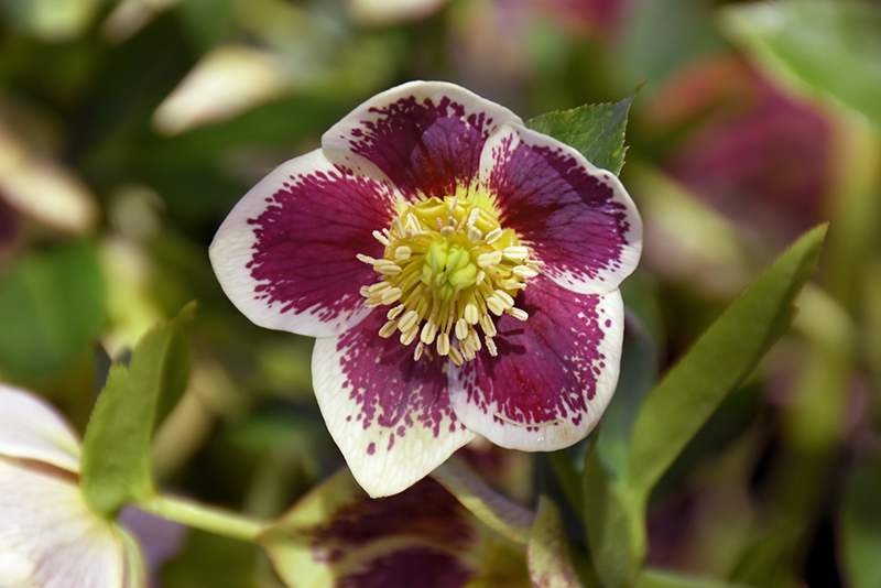 Honeymoon® Romantic Getaway Hellebore features showy nodding burgundy cup-shaped flowers with violet overtones, chartreuse eyes and white edges at the ends of the stems from late winter to early spring. Its glossy oval compound leaves remain green in color throughout the year.