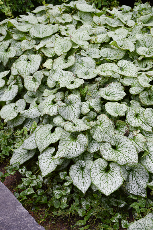 Stunning heart shaped leaves are shiny silver with contrasting, thin dark green veins; clusters of tiny blue flowers in spring; a wonderful shade accent plant; best in moist, rich, well drained soil