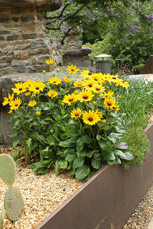 Black-eyed Susan is a fine choice for the garden, but it is also a good selection for planting in outdoor pots and containers. With its upright habit of growth, it is best suited for use as a 'thriller' in the 'spiller-thriller-filler' container combination; plant it near the center of the pot, surrounded by smaller plants and those that spill over the edges. It is even sizeable enough that it can be grown alone in a suitable container. Note that when growing plants in outdoor containers and baskets, they may require more frequent waterings than they would in the yard or garden.