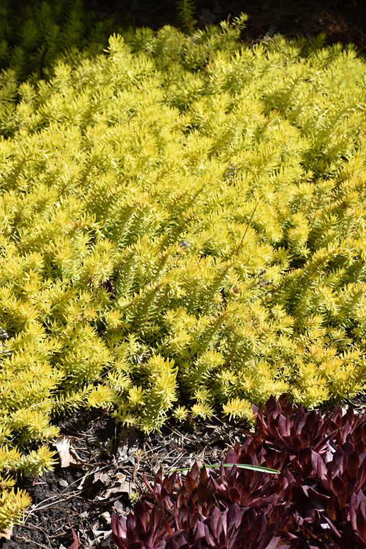 Angelina Stonecrop will grow to be only 6 inches tall at maturity extending to 8 inches tall with the flowers, with a spread of 10 inches. When grown in masses or used as a bedding plant, individual plants should be spaced approximately 10 inches apart. Its foliage tends to remain low and dense right to the ground. It grows at a fast rate, and under ideal conditions can be expected to live for approximately 10 years. As an herbaceous perennial, this plant will usually die back to the crown each winter, and will regrow from the base each spring. Be careful not to disturb the crown in late winter when it may not be readily seen!