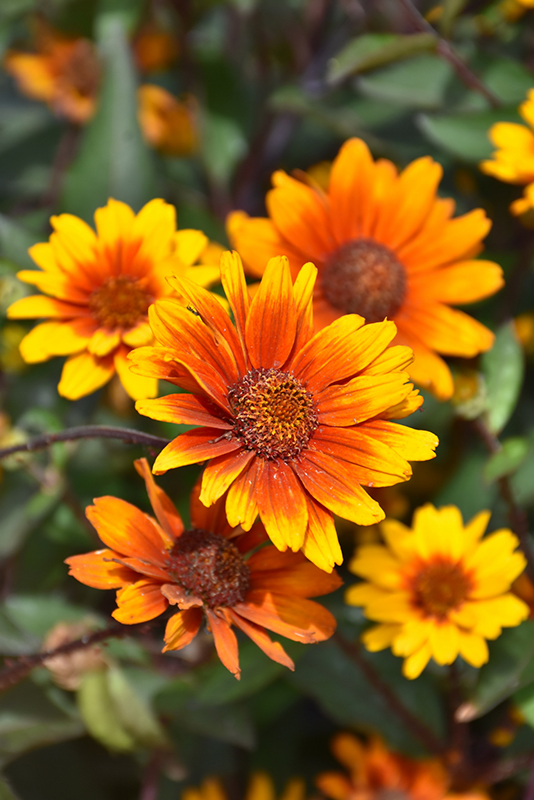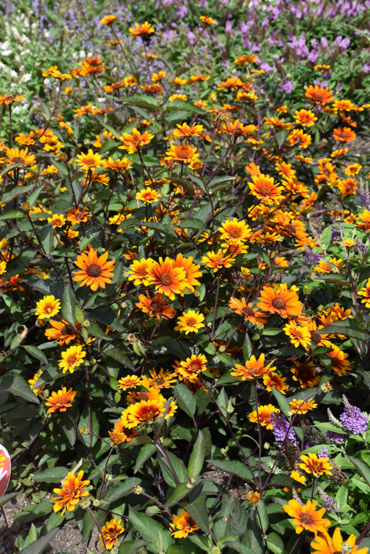 Summer Eclipse False Sunflower has masses of beautiful orange daisy flowers with scarlet overtones, coppery-bronze eyes and gold tips at the ends of the stems from early summer to early fall, which are most effective when planted in groupings. The flowers are excellent for cutting. Its attractive serrated narrow leaves remain grayish green in color with hints of deep purple throughout the season. The dark red stems are very colorful and add to the overall interest of the plant.