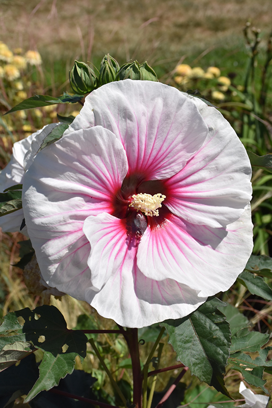 Angel Eyes Hibiscus features bold white round flowers with dark red eyes and a hot pink flare along the stems from mid summer to early fall. Its large serrated lobed leaves remain green in color throughout the season.