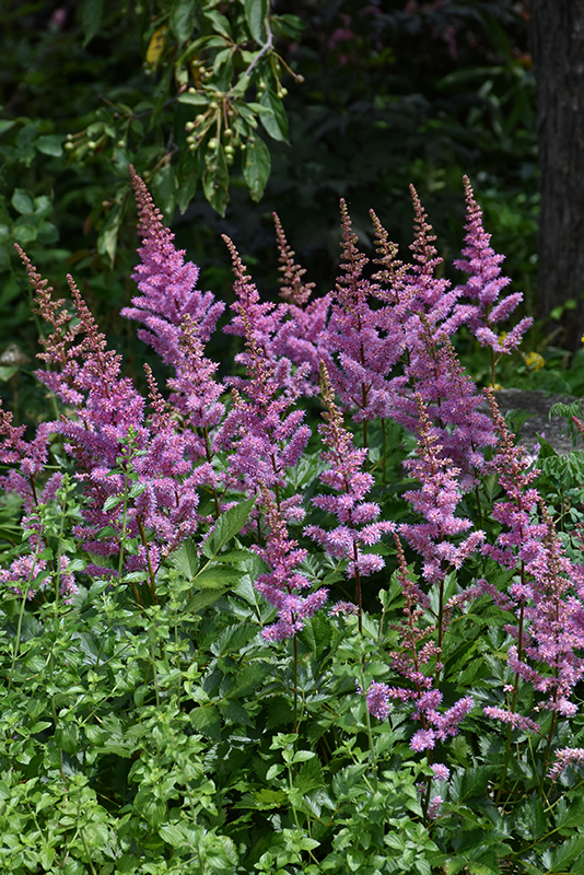 Striking lavender-pink colored plumes rising above glossy leaves; perfect in a shady spot with dappled light; prefers moisture so water regularly for abundant flowers and nice foliage