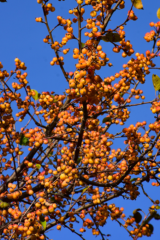 Golden Raindrops Flowering Crab is bathed in stunning clusters of fragrant white star-shaped flowers with yellow eyes along the branches in mid spring, which emerge from distinctive rose flower buds before the leaves. It has attractive dark green deciduous foliage. The deeply cut lobed leaves are highly ornamental and turn an outstanding orange in the fall. The fruits are showy yellow pomes carried in abundance from early to mid fall.