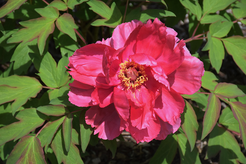 A beautiful woody peony for the garden, with bold flowers in a rich ruby red with prominent yellow stamens, great as an accent in the garden or massed in borders; unlike perennial peonies, remember not to prune this variety